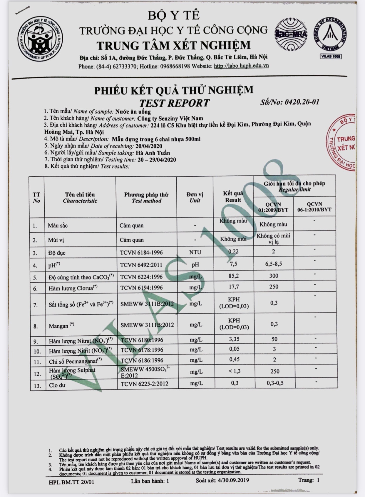 Toàn bộ các tiêu chí đều đạt, đặc biệt có những chỉ tiêu chỉ bằng vài phần ngàn mức độ cho phép, đảm bảo cao để sử dụng sinh hoạt hàng ngày.